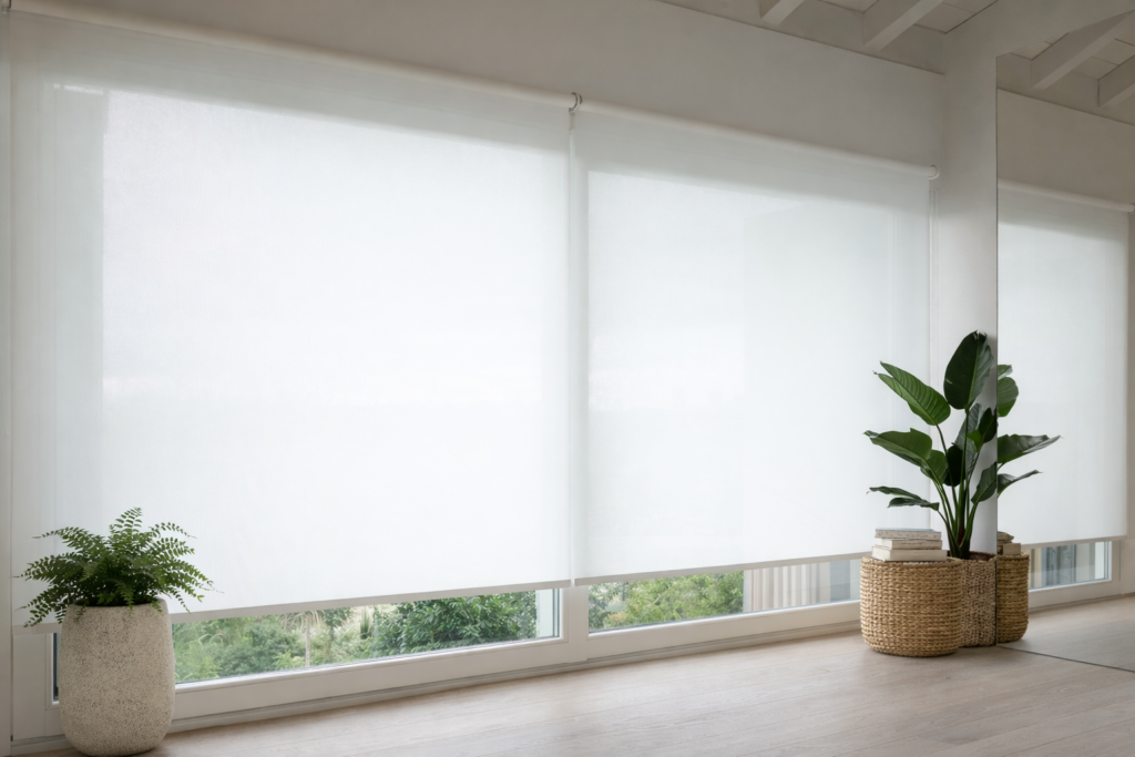 Interiér s bielymi roletami a zelenými rastlinami.